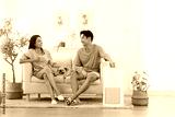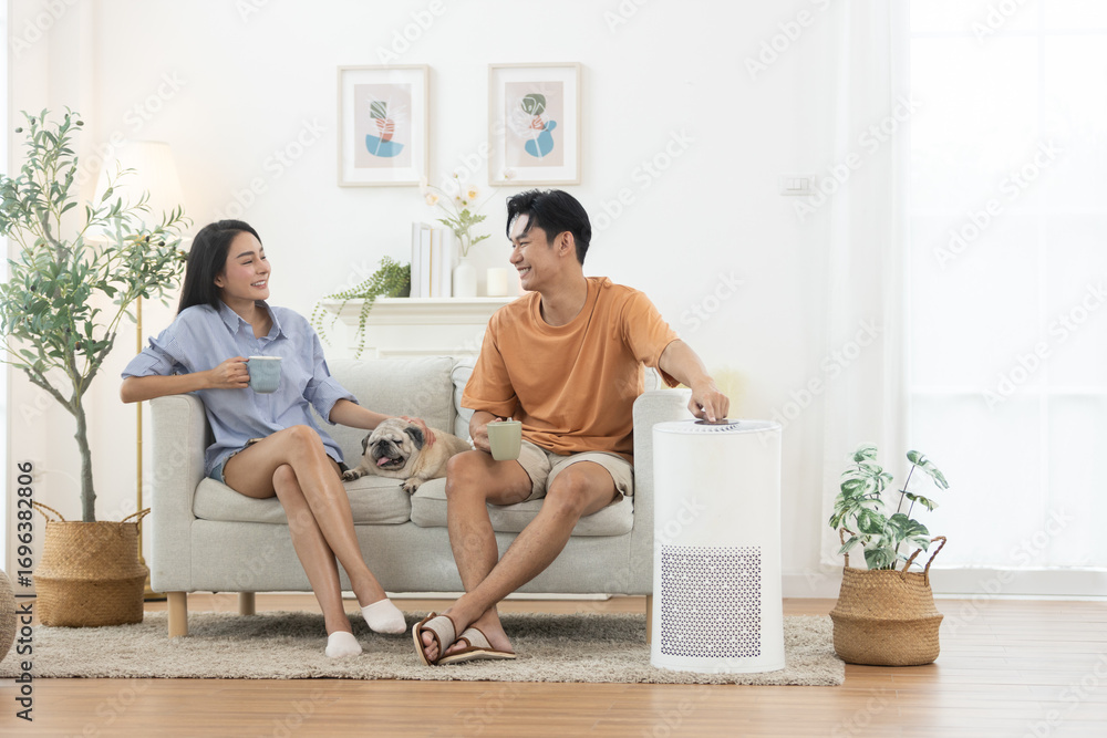 Asian couple relaxing on sofa with coffee and dog, using air purifier at home. Cozy lifestyle with pet, love, and health care concept in modern living room. Morning relaxation and freshness.