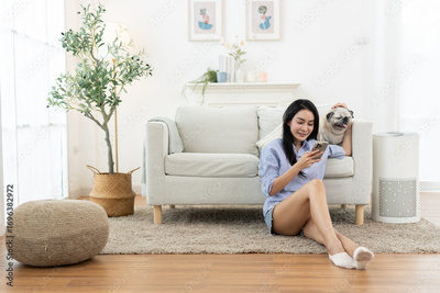 Asian women smiling while using smartphone and cuddling pet dog in cozy living room. Concept of happy digital lifestyle, pet companionship, indoor wellness and relaxing home environment.