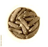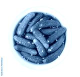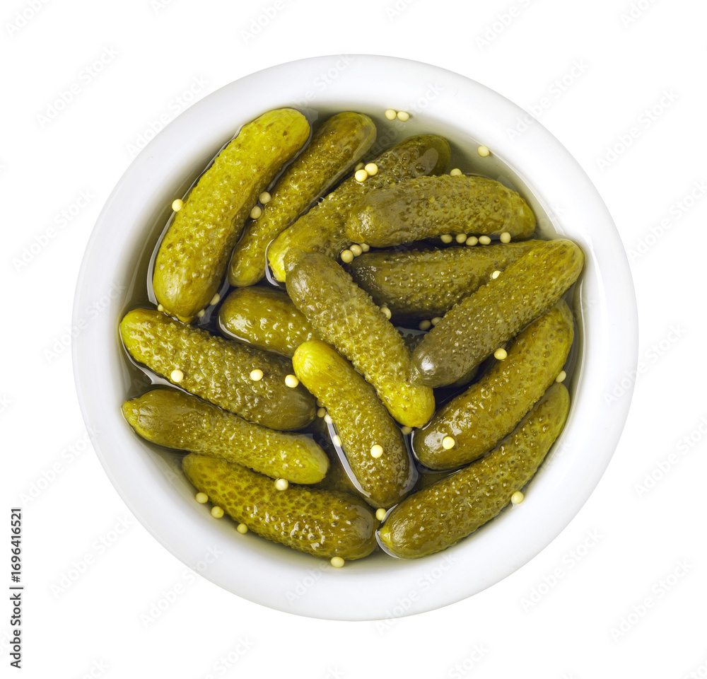 Bowl of gherkins pickled in vinegar with mustard seeds on transparent background