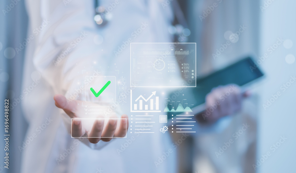 Concept healthcare data compliance and quality assurance doctor presenting virtual check icon and analytics dashboard, symbolizing approval, medical standards, performance monitoring, patient trust.