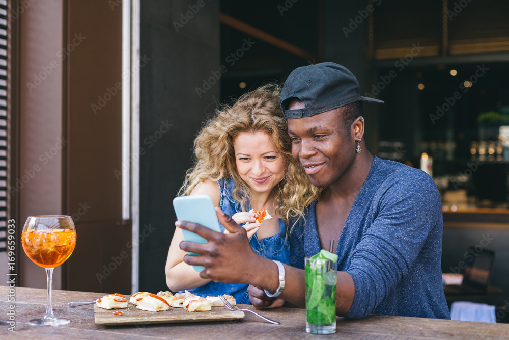 Loving couple watching the smartphone during aperitif in a local