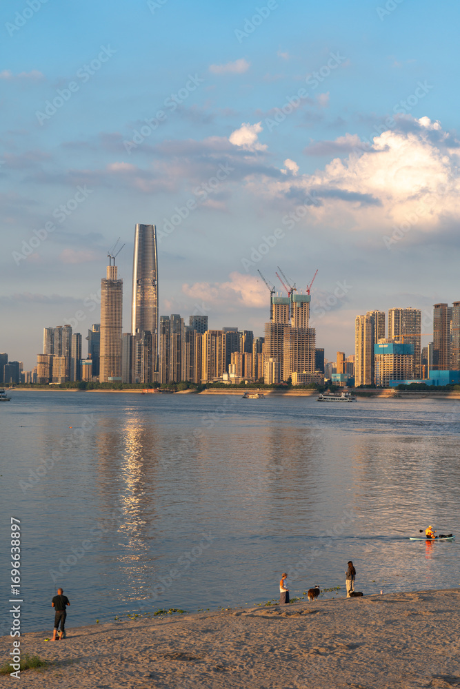 A river scene shows buildings on the shore and people enjoying the water.