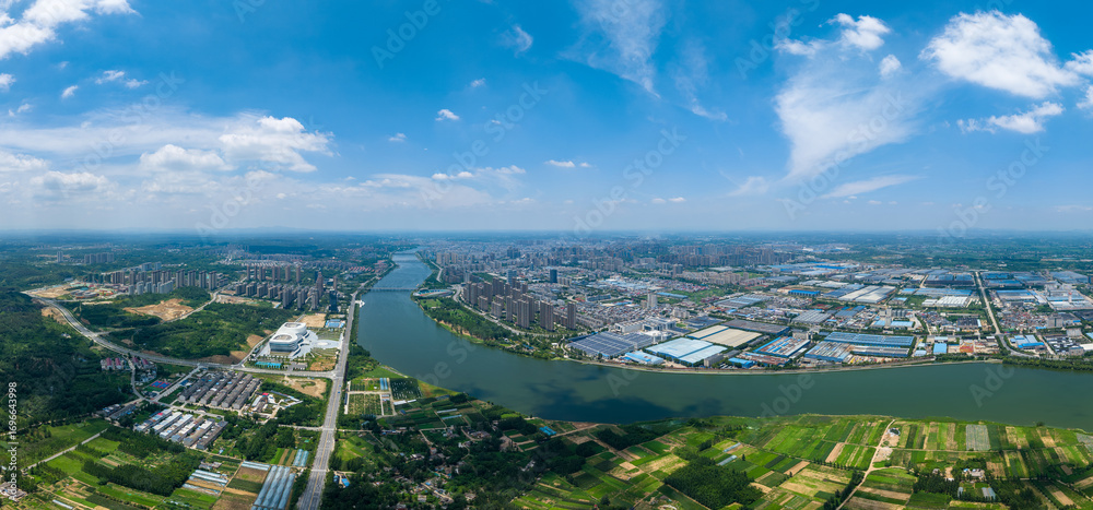 Suizhou City China shows buildings by the river under a bright blue sky with white clouds.