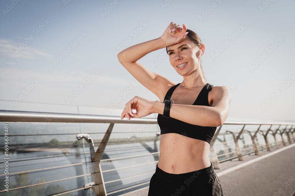 The athlete watches cardio, fitness in the city bridge road. A woman looks at sports and counts calories during training. Exercise coach on the street seaside promenade, healthy lifestyle.