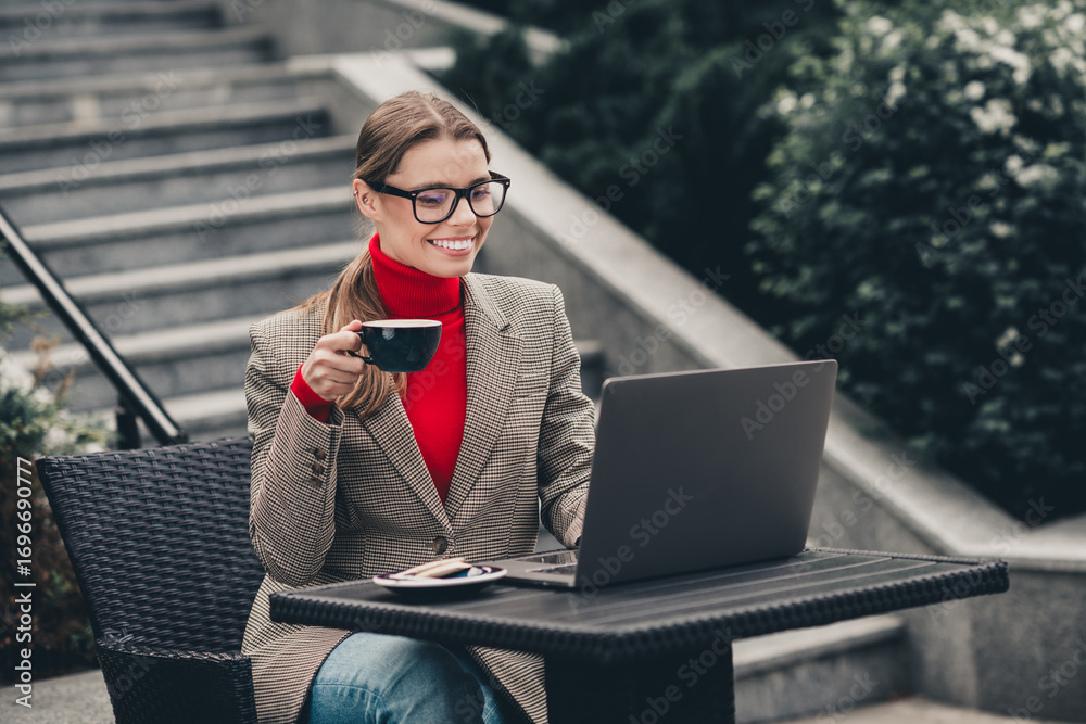 Young professional businesswoman with coffee cup working outdoors on laptop at stylish urban cafe