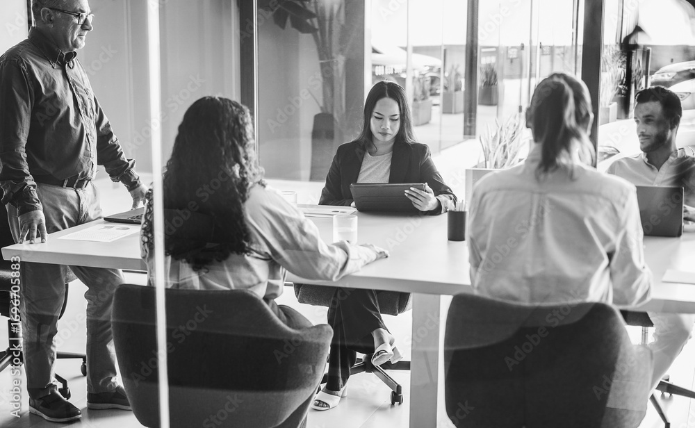 Multiracial colleagues working inside business office with glass walls - Entrepreneurs people sharing ideas at job meeting - Brainstorming concept - Focus on left man face - Black and white editing