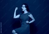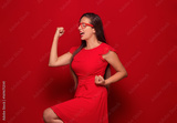 Excited beautiful young woman with closed eyes and clenched fists, isolated on red background. Yes concept. Good news.