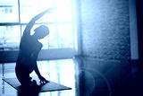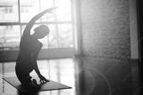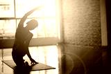 Asian woman doing yoga in a room with sunlight coming through the window.