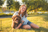 Portrait of one brown portuguese water dog outdoors on grass with little child girl