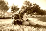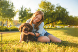 Portrait of one brown portuguese water dog outdoors on grass with little child girl