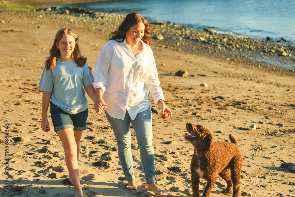 brown portuguese water dog outdoors on the beach with mother and daughter