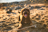 Portrait of one brown portuguese water dog outdoors on the beach with stick