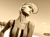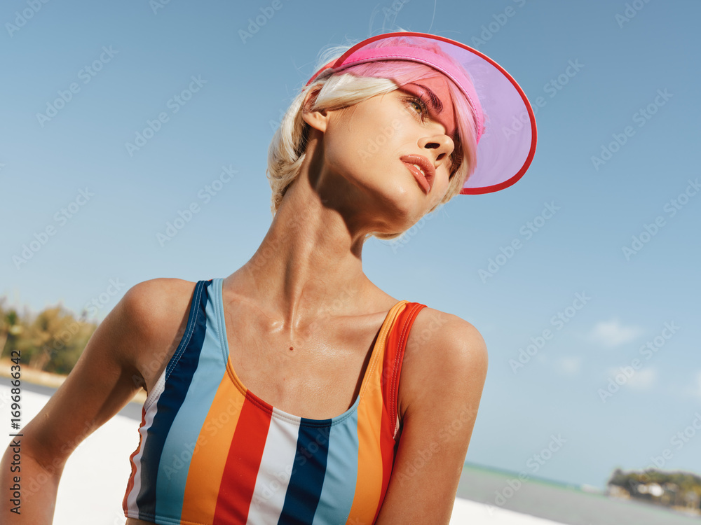 A stylish woman on a sunny beach wears a colorful striped swimsuit and pink visor, posing with confidence as sea breeze and clear blue sky frame the scene.
