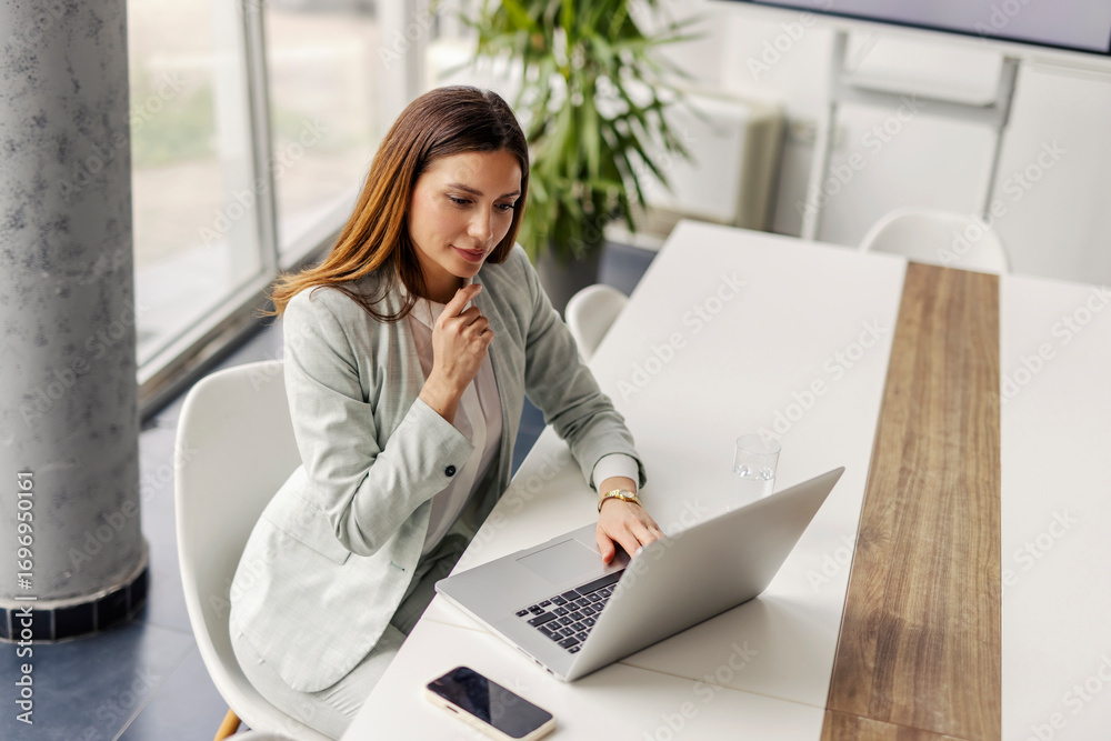 Professional Businesswoman in Modern Office Using Laptop at a White Desk