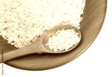 Glutinous rice grains filling wooden spoon and bowl on transparent background