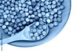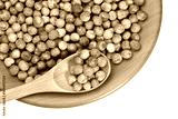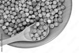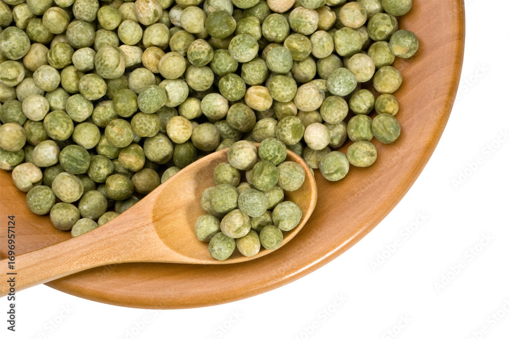 Wooden spoon resting on bowl of dried green peas on transparent background