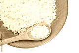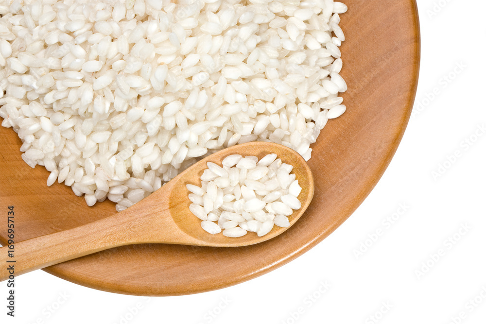 Arborio rice grains in wooden spoon and bowl on transparent background