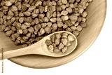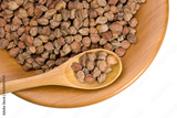 Wooden spoon resting on bowl of chickpeas on transparent background