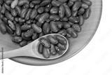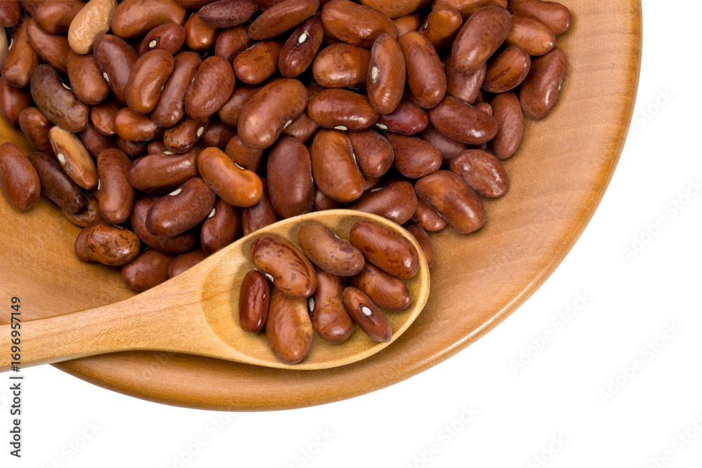 Light red kidney beans resting on wooden spoon and plate with transparent background