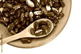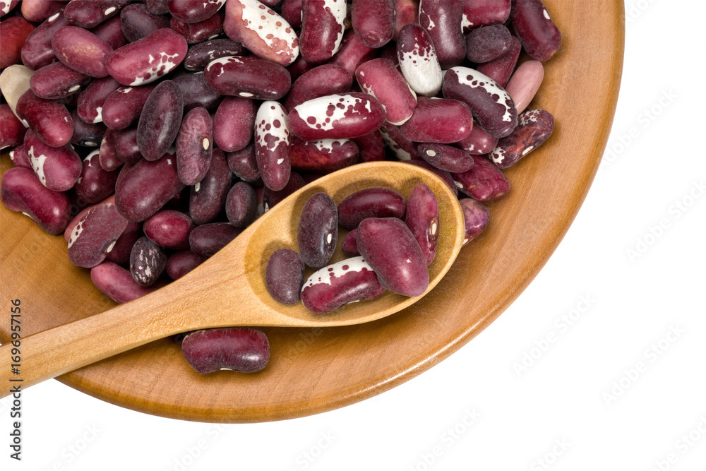 Red speckled kidney beans resting on wooden spoon and plate with transparent background