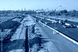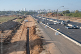 Multi-lane asphalt road in Netanya urban area with traffic, city infrastructure, and buried cable installation for digital systems