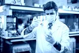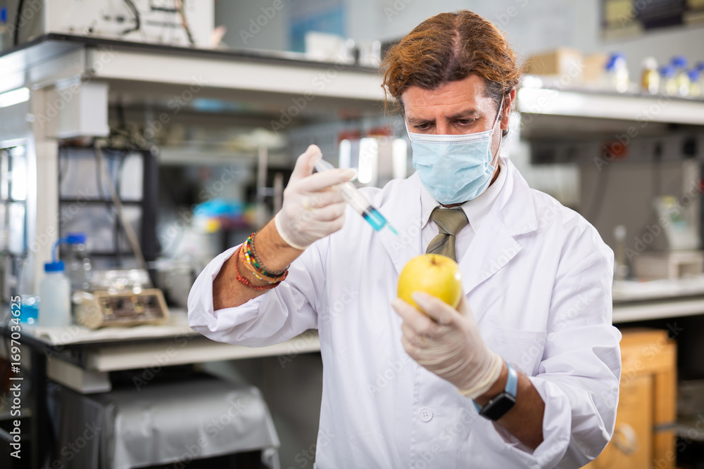 Focused male scientist working in food testing laboratory, provide testing services of apple to support quality control