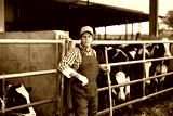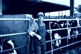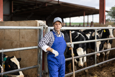 Adult male farmer posing against backdrop of feeding cows on dairy farm