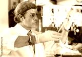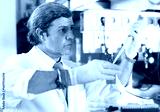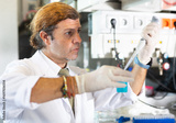 Focused male chemist pipetting blue reagent into solution in test tube while performing experiments in university