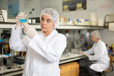 Concentrated woman scientist chemist works with liquids in beaker in science laboratory