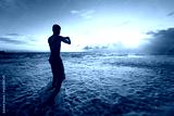 man taking photos of sunset on tropical beach by smartphone