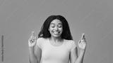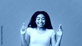 Cherished wish. African american lady crossing fingers and smiling, begging for luck, praying for miracle, standing over blue studio background. Excited woman hoping for good things to happen