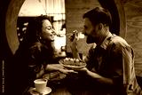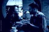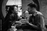 Happy woman being fed with cake by her boyfriend in cafeteria.