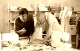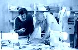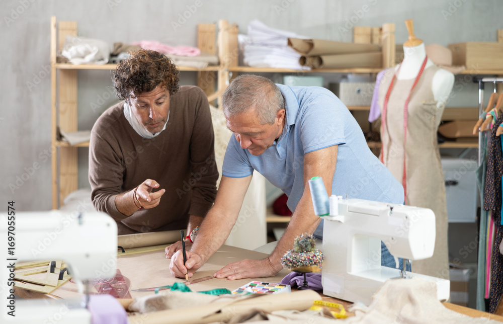 In cloth workroom, men designer draw diagram of future clothing product coat on paper. Tailor workplace with cut textile, sewing machine, thread, pins, needles, tape, cutouts
