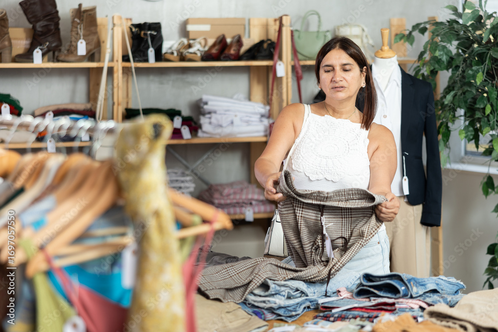 Woman view assortment in clothing department, buying lady trousers. Off line cloth store from leading retailer. Buyer browsing through apparel on display rack. Outlet, discount day on Black Friday.