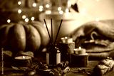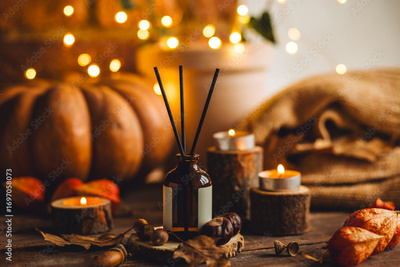 Cozy interior with knitting, burning candles and aroma perfume diffuser in the living room. Fall scent, sweet pumpkin pie fragrance, dry leaves, autumn mood. Home comfort, coziness, aromatherapy
