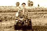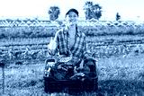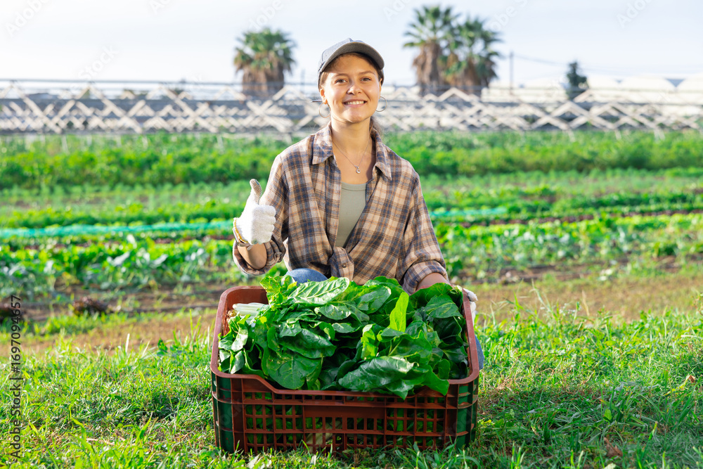 Farmer girl harvests acelga in field, performs agricultural work in subsidiary farm. Female worker from group of granger assistants is preparing fresh acelga for shipment.