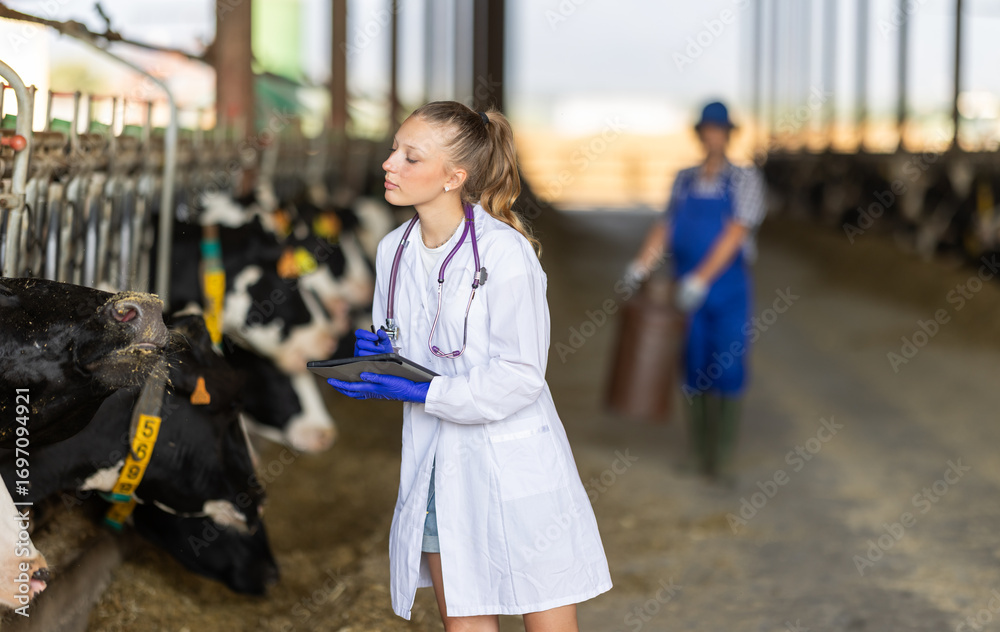 Focused girl veterinarian checking livestock and taking notes on tablet in rural shed
