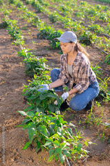 Young woman farmer during harvest of bell peppers from beds in field