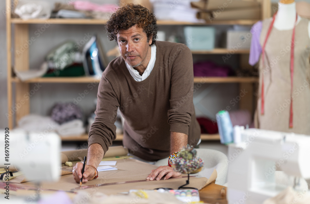 Man tailor draw dress pattern of product on paper. Craftsman perform paper prototype of product parts, drawing paper pattern for dressmaking.