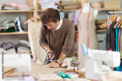 Adult male tailor cutting out pattern from paper with scissors in sewing workshop