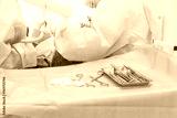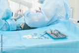 Dental tools and syringe at dentist's surgery table on the background of surgery implant process . Selective focus. Space for text