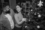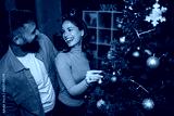 Happy couple decorating christmas tree wearing reindeer antlers headband