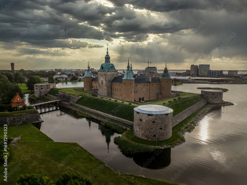 Aerial view of Kalmar castle with round gun platform towers stormy sky