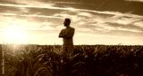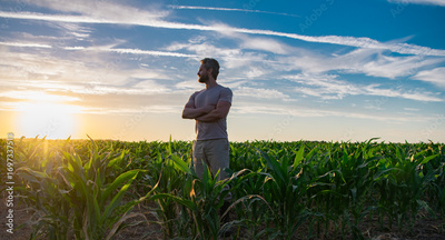 A farmer inspects the cornfield on sunrise. The male farmer works outdoors in the field. Agricultural worker farmer harvesting corn. A man examines the maize crop. Farmers work to harvest the crop.