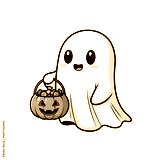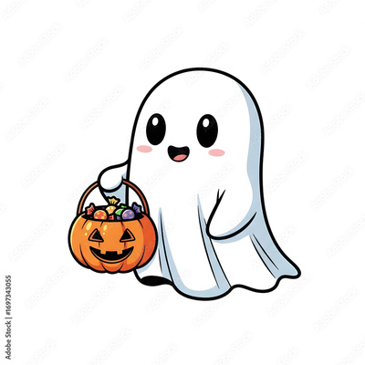 Adorable kawaii ghost character delightedly holding a pumpkin bucket overflowing with colorful Halloween candies, perfect for festive designs and spooky fun.
