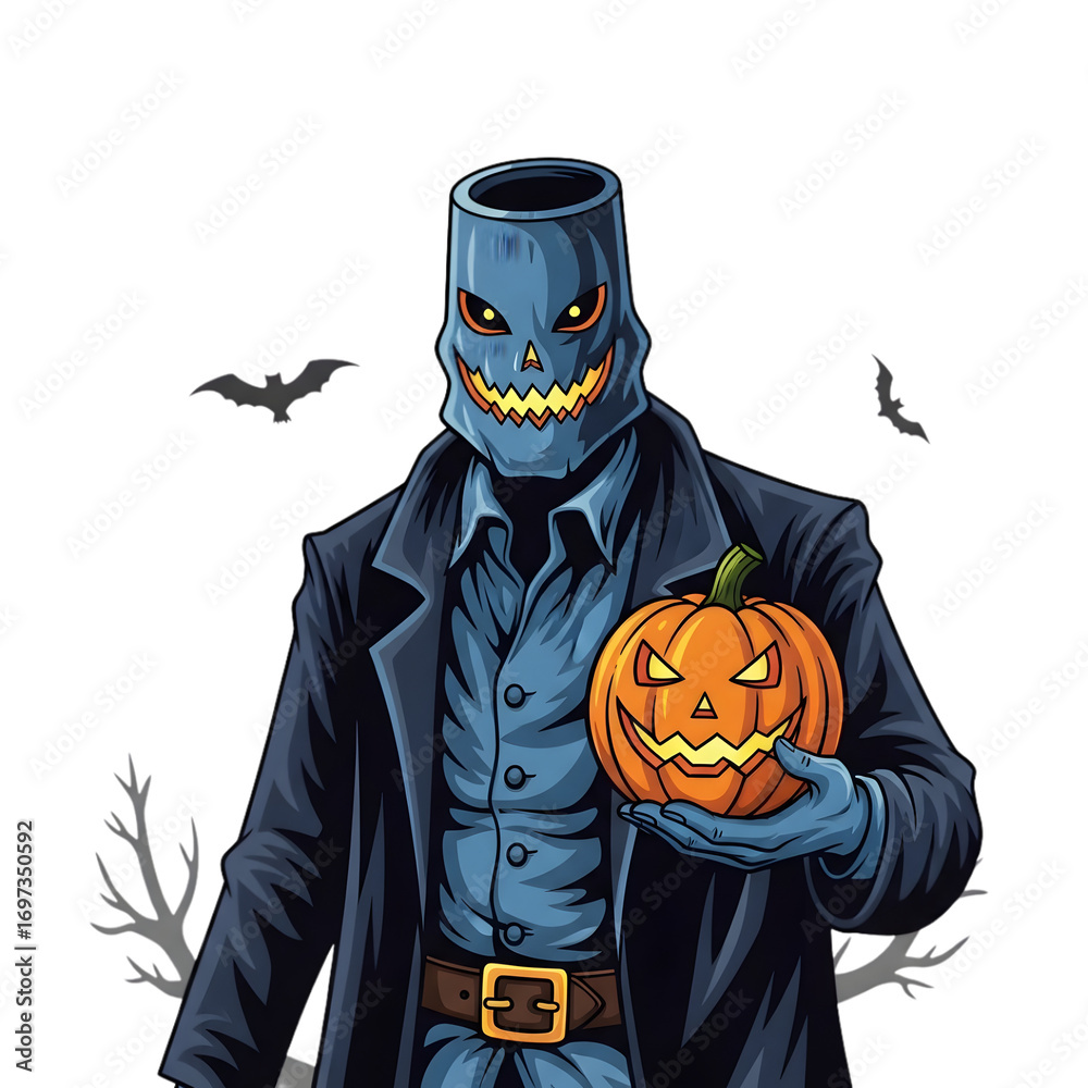 Spooky Halloween character with jack-o'-lantern head and a smaller pumpkin, ready for trick-or-treat festivities and eerie autumn celebrations
