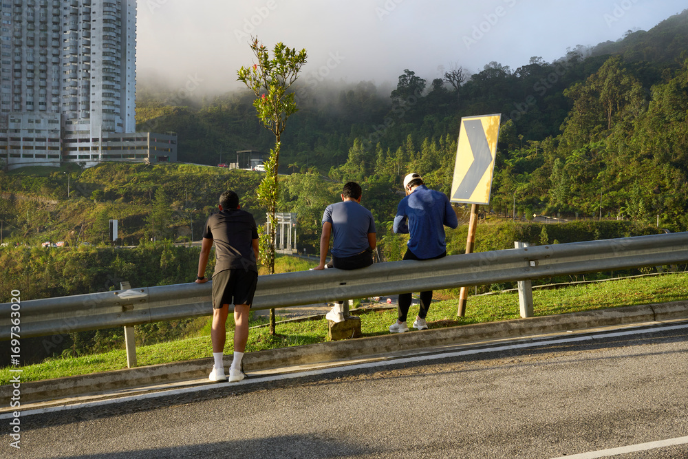 Athletes resting on guardrail overlooking valley with buildings and lush green hills