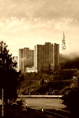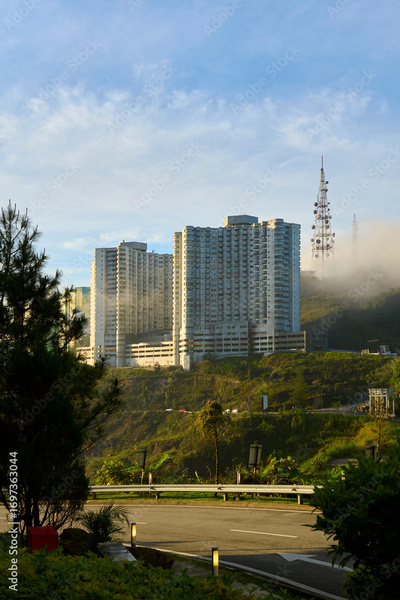 Modern apartment buildings rising above the clouds on a hillside with lush greenery and winding road
