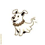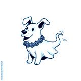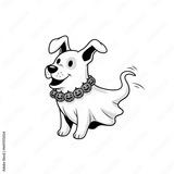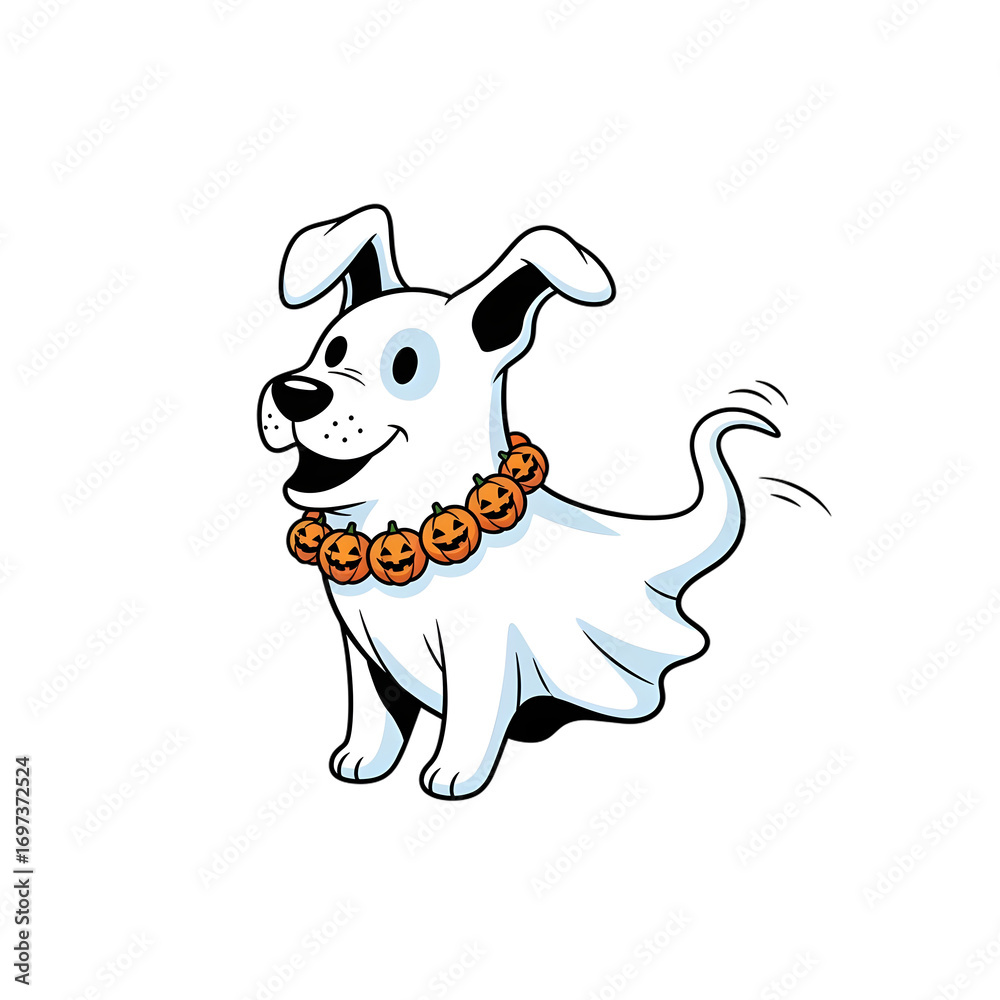 Adorable cartoon ghost dog wearing a festive pumpkin necklace, perfect for Halloween celebrations and spooky-themed designs, bringing playful charm to any project.