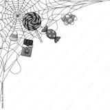 Spooky Halloween treats like candy corn, lollipops, chocolate bars, and wrapped candies scattered on a web, perfect for festive party invitations and seasonal decorations.